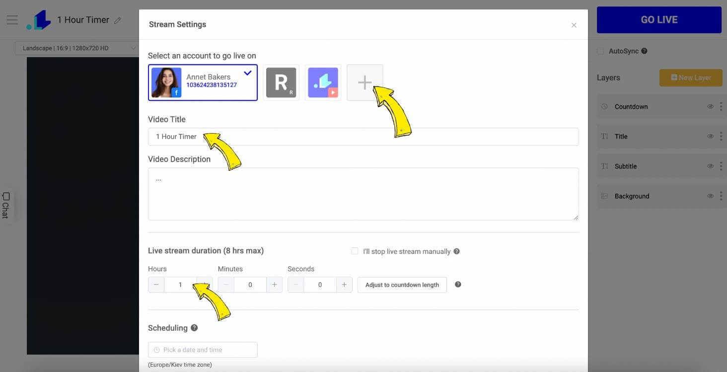 In the tutorial below, we'll show you how to create a 1 hour timer, add it seamlessly as a live stream, or before the actual show starts, or even during breaks. And the best part is that you can post this 1 hour timer on all your favorite platforms—Facebook, YouTube, Instagram, LinkedIn, Twitch, Twitter, and any custom RTMP destination. Shall we start?