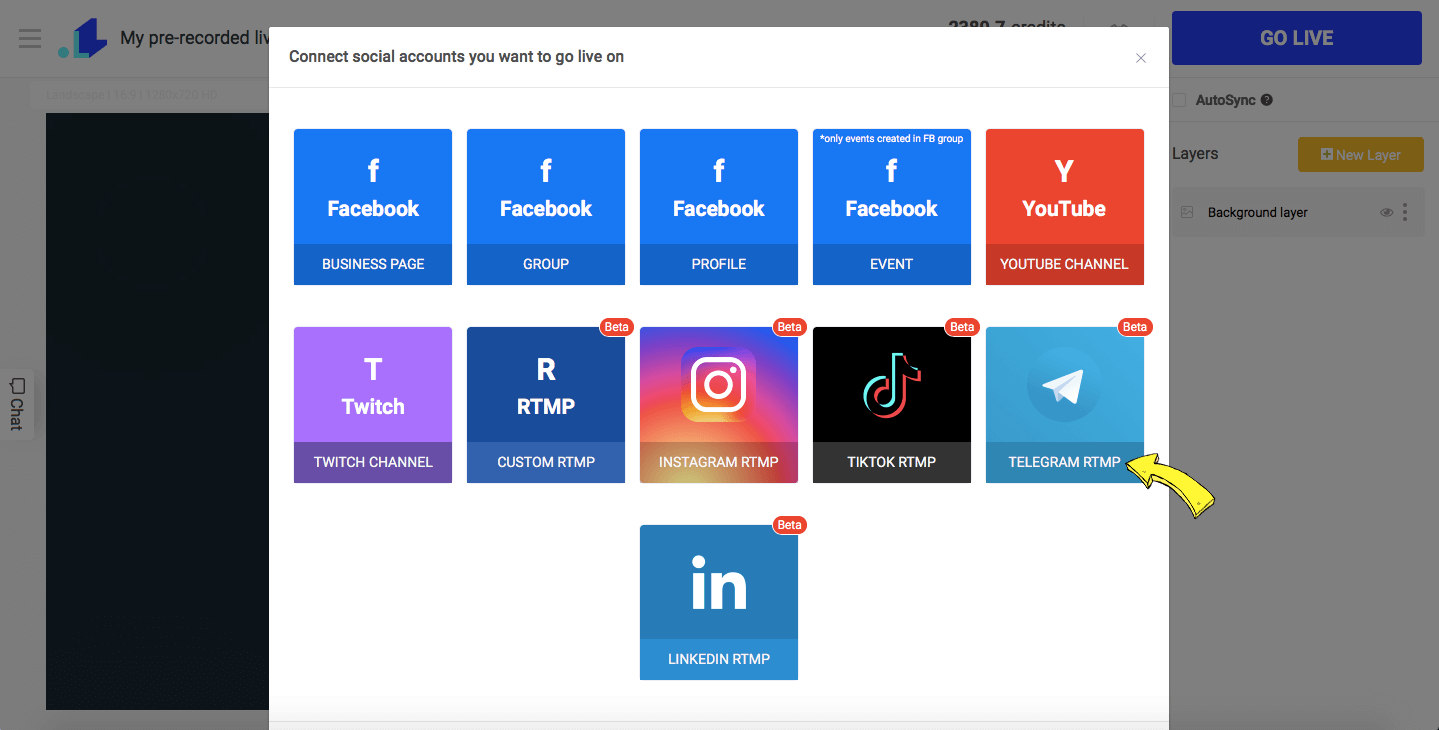 Step 4. Open LiveReacting Settings and add a Custom Telegram RTMP channel.