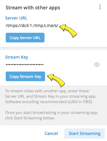 Step 2. Copy Telegram Server URL and Stream Key. Don't close these settings, as you'd need to access them again to click Start Streaming after you set up your stream in the LiveReacting.