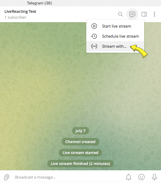 Step 1. Click on streaming icon in your Telegram channel and select Stream with...