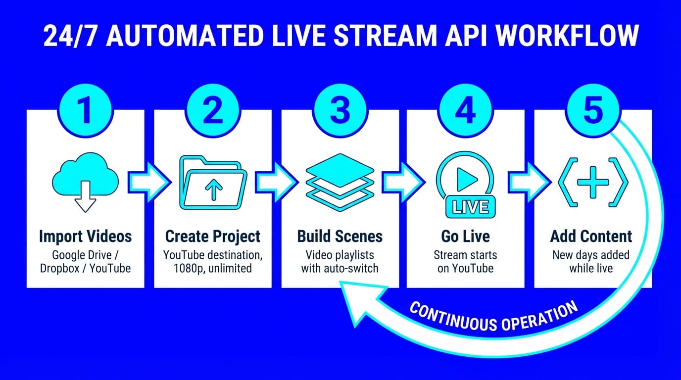 Running a 24/7 live stream means uploading new videos, building playlists, and making sure the stream never stops. When you're doing this daily, it doesn't scale. You either hire someone to manage it or you automate it.