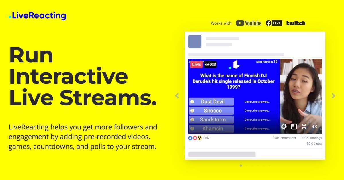 LiveReacting is a live streaming studio for Social Media Managers, Digital agencies, brands and influencers that helps to enrich any live video with interactive elements and graphics in order to get more engagement and views.