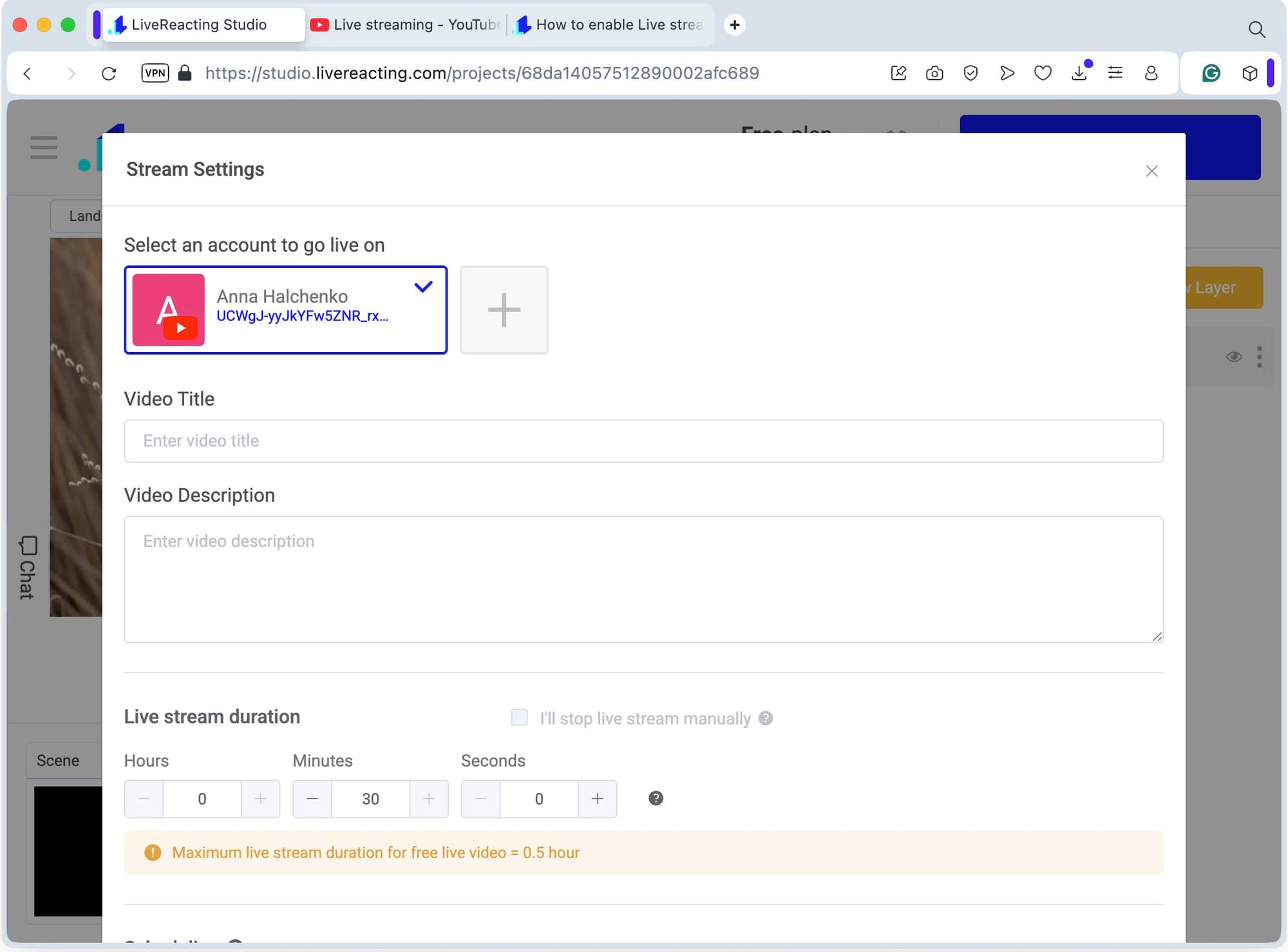 - Fill in the title, description, and set how long you want the broadcast to last. If you’d rather schedule it, LiveReacting lets you pick a time in advance.