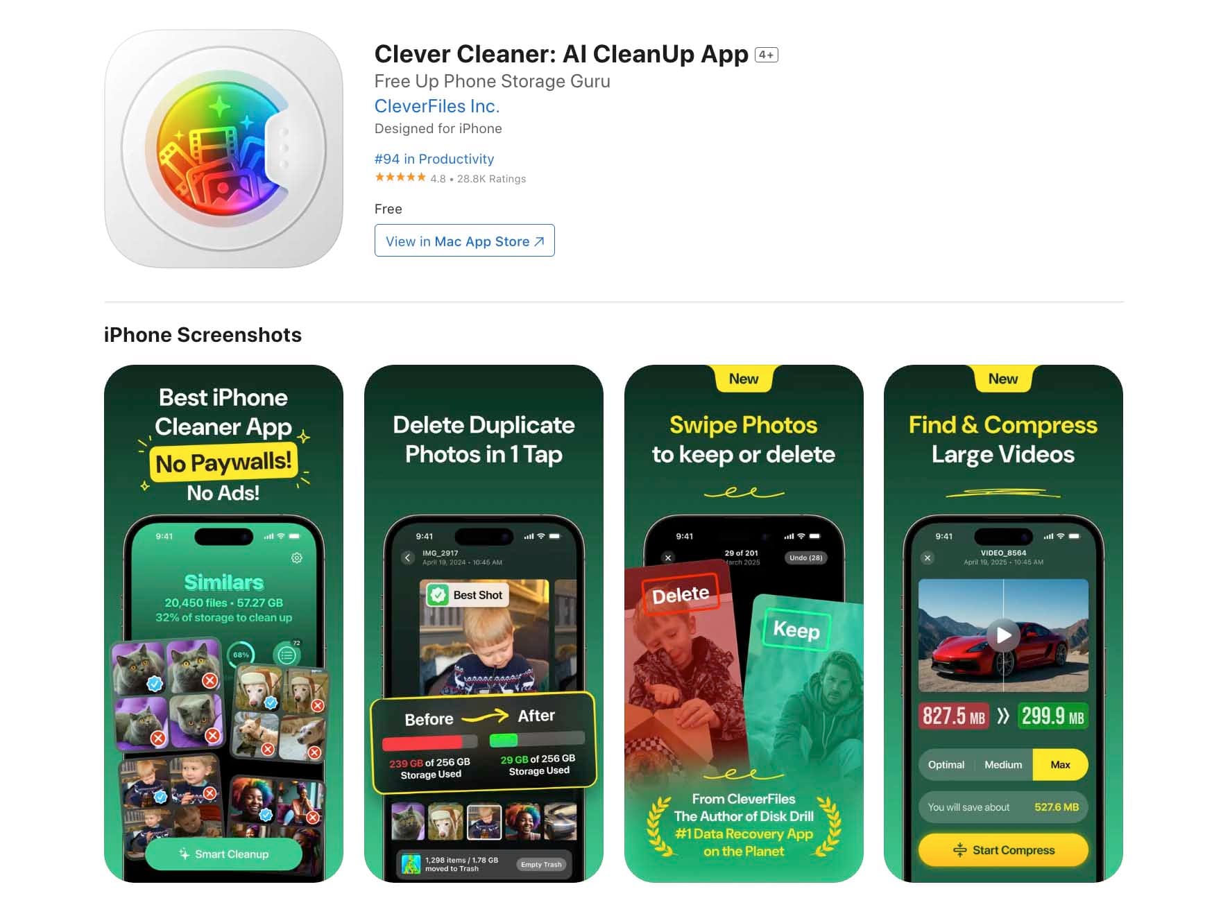 If the free space on your iPhone already looks tight, don’t wait for the “Storage Full” message to ruin a recording. Clear some room before you press record. Unused apps you’ll have to remove by hand, but the Photos app can be cleaned up automatically. That’s where a tool like Clever Cleaner helps — it spots duplicates, screenshots, Live Photos, and also surfaces large videos on iPhone, then lets you wipe them in a few taps. Afterward, check iPhone Storage again and keep a safety margin of at least 15–20 GB for long sessions.