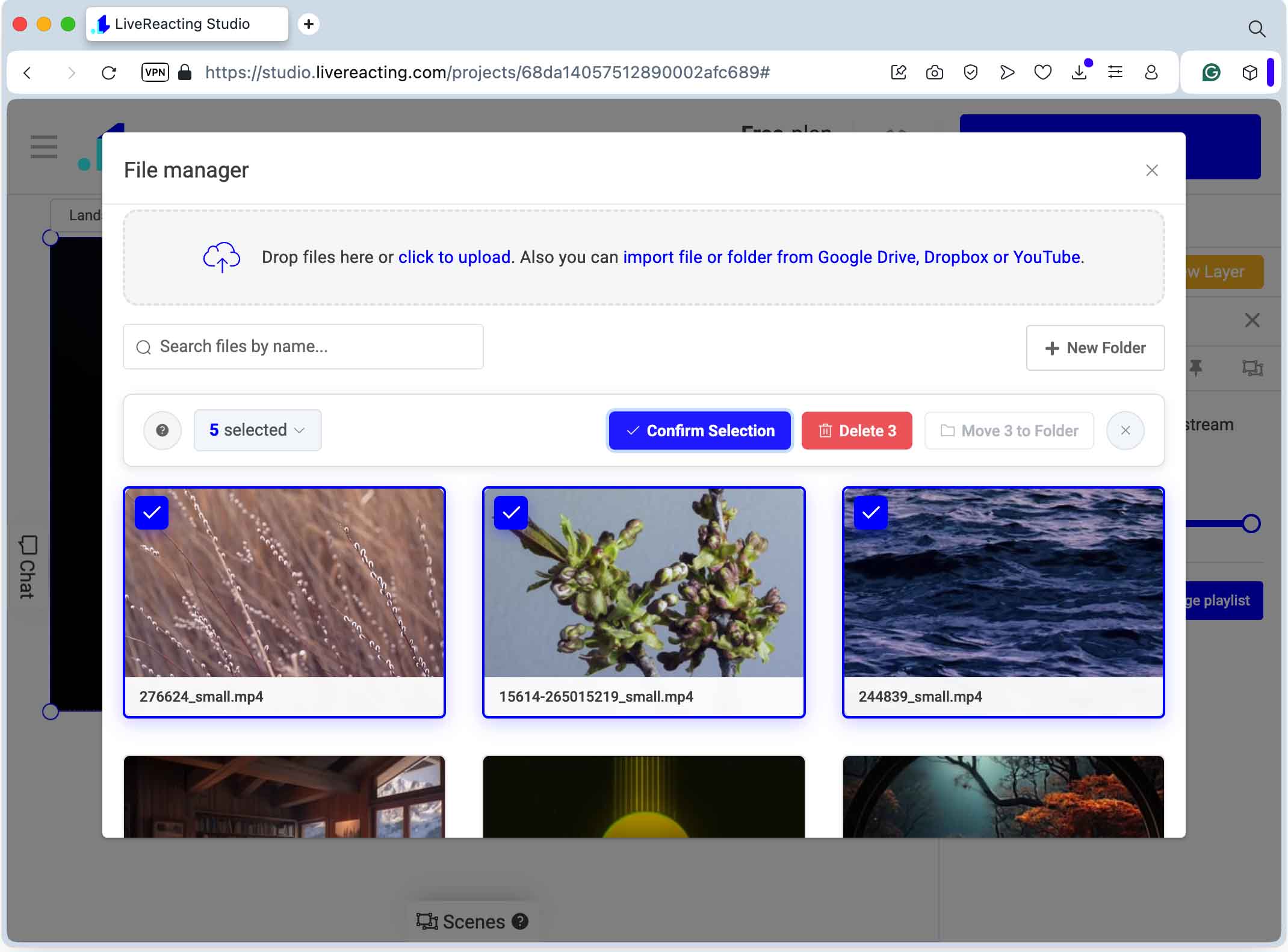 - Once uploaded, select the clips you want included in your stream and confirm your choice. Your playlist will appear in the sidebar, ready for you to adjust the order or make quick edits.