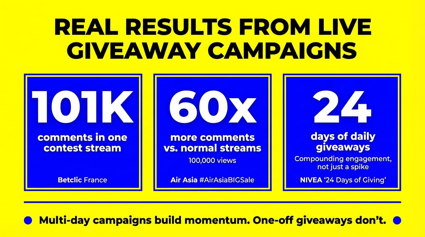 Social media algorithms reward consistency. When viewers comment on your streams day after day, platforms push your content to more people. That's how NIVEA's 24-day campaign built compounding engagement, not just a single spike.